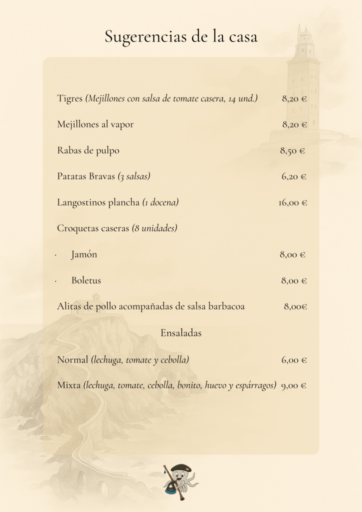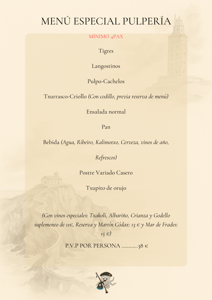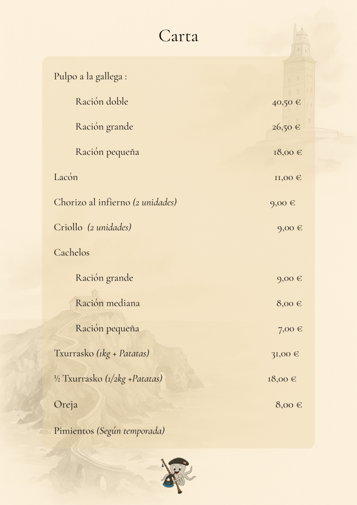 En la Pulpería Arizgoiti no solo vienes a comer: vienes a disfrutar de una experiencia gastronómica con raíces. Nuestra carta está cuidadosamente diseñada para ofrecer lo mejor de la cocina tradicional gallega, con platos elaborados al momento, productos de calidad y ese toque casero que nos distingue.